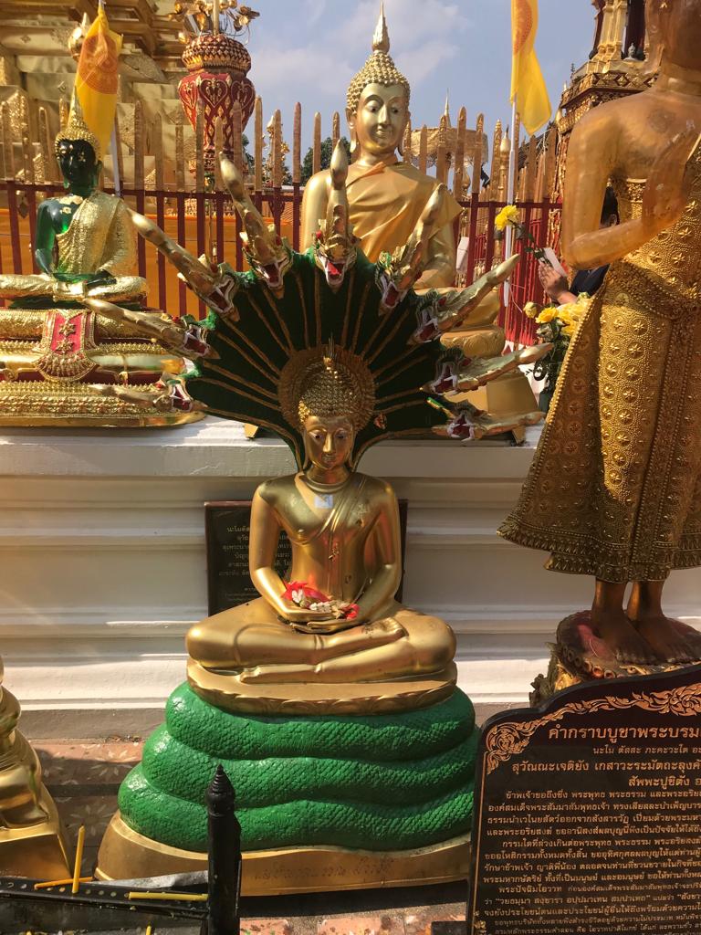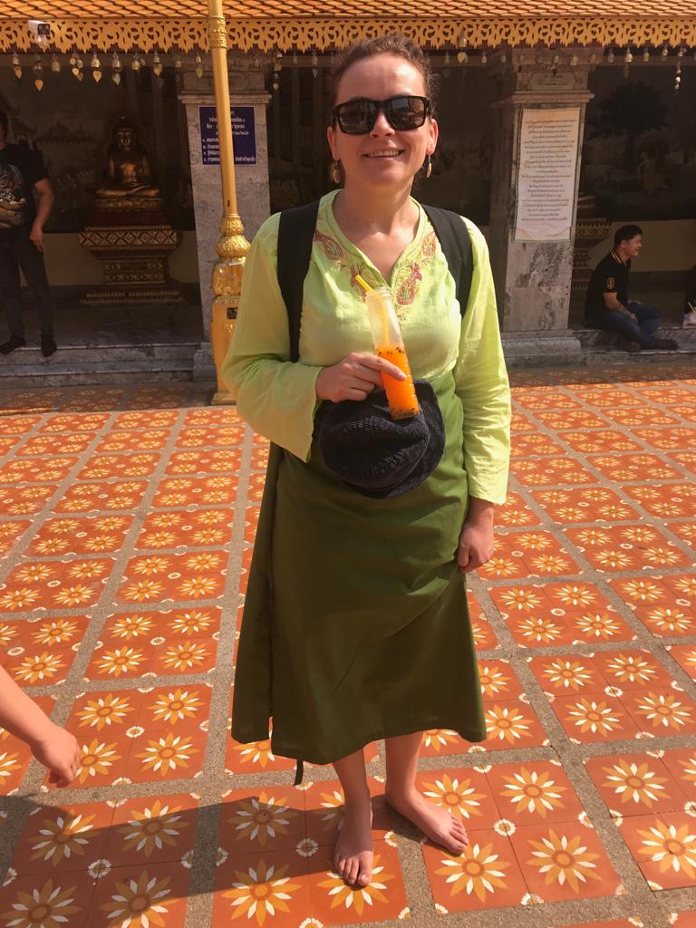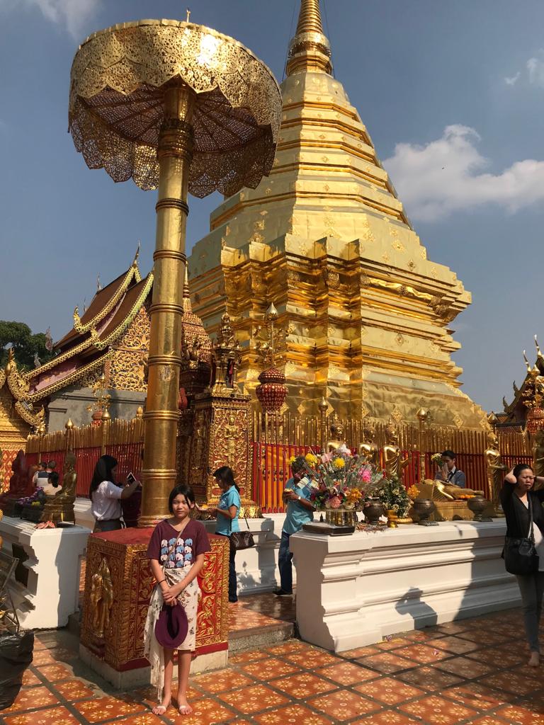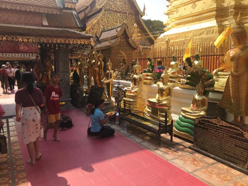 La terasă am citit pe net despre atracții și am hotărât să mergem la templul Wat Phra That Doi Suthep, de unde poți avea o panoramă frumoasă asupra orașului. Din cauza urcușurilor, tuk-tukurilor sunt rare și au fost înlocuite cu niște dubițe roșii fără pereți, cu câte o bancă de o parte și de alta. Toate prețurile la transport au explodat față de Bangkok și, în timp ce negociam un taxi fără a avea cel mai mic habar cât de jos trebuie să mă duc, am făcut gașcă cu trei asiatice simpatice care mergeau tot la templu. Am aflat ulterior că sunt din Coreea de Sud și am făcut ceva conversație cu una dintre ele care vorbea engleză binișor, locuise prin America o vreme. Pe măsură ce urcam muntele, începuseră să apară tarabele cu suveniruri, iar, când am fost debarcați la destinație, am știut imediat că aterizasem în raiul turiștilor, deci, automat, iadul meu. O agitație ca la vreun hram de-al nostru, tarabă lângă tarabă, un soi de Bâlea lac, dar fără muzică și fără mici. După ce am hidratat bine găinile leșinate și omu’ febril, ne-am apucat de urcat scările, multe și abrupte. Pentru mine asta a fost singura parte drăguță a locului, sus era o kitsch-uială maximă (care de data asta m-a deranjat, dar oare ce nu m-a deranjat în decursul întregii zile?!), noroc cu vegetația luxuriantă care a mai salvat experiența.