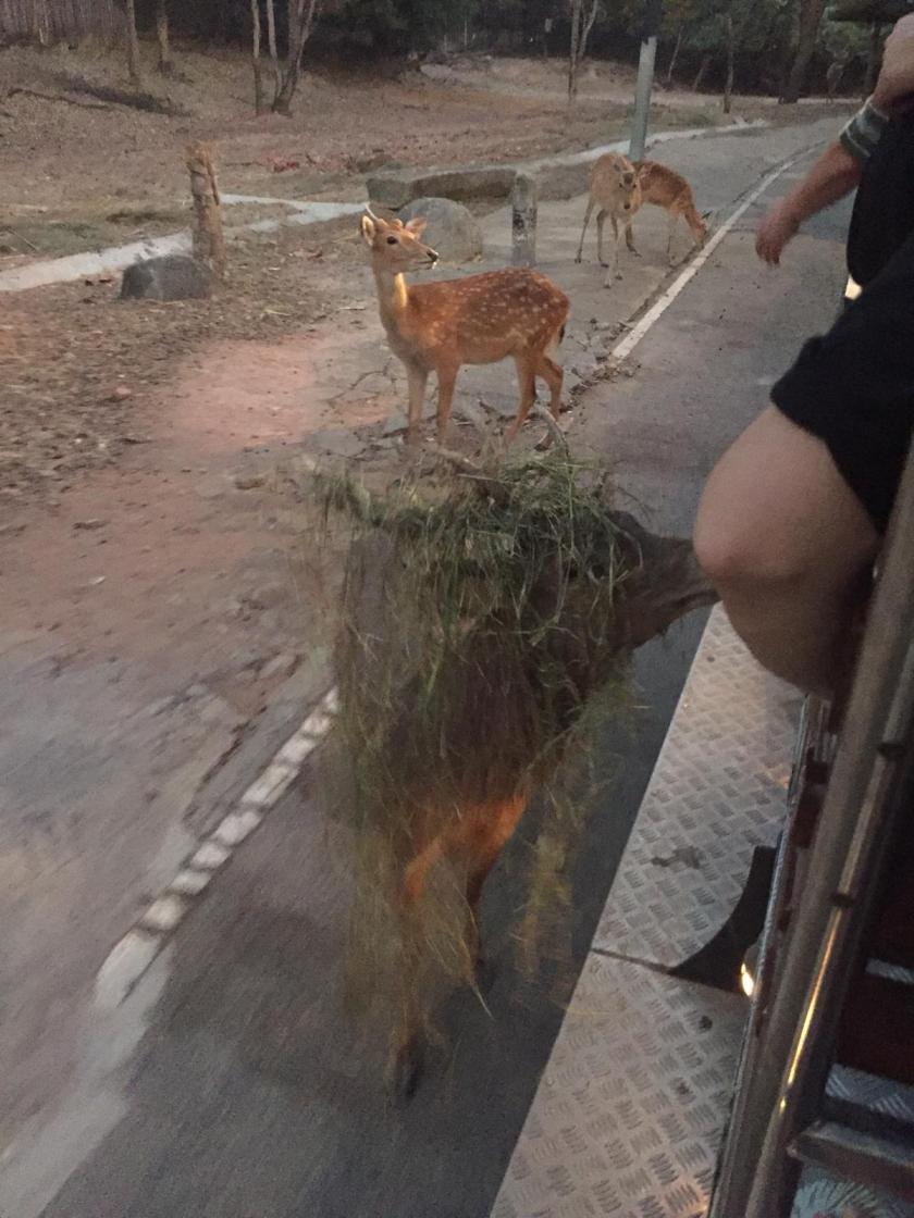 Împreună cu cei 1000 de chinezi, ne îndreptăm apoi spre Night Safari. A fost partea cea mai frumoasă a zilei, începând de la crepuscul care a durat doar câteva minute până la lăsarea nopții, ne-am plimbat într-un trenuleț ca la Mamaia, dar pe roți, printre zebre, girafe, bivoli, elefanți… Erau două tururi, unul în thailandeză, unde nu era aproape nimeni, și unul în engleză și chineză, unde ne-am urcat toți. Ghidul a fost delicios, nu știu ce zicea în chineză, dar, la partea de engleză, era plin de glumițe inspirate. Girafele se aplecau să le mângâi pe cap, zebrele se uitau suspect la noi de pe marginea drumului, hienele se roteau în jurul cozii crezând că le-a picat o cină cu stele michelin, iar elefanții se pregăteau să arunce niște noroi din trompă înspre noi ceea ce l-a amuzat teribil pe ghid și pe cei 1000 de chinezi. Cireașa de pe tort a fost un ghepard zărit printre copaci la a cărui vedere aia mică a tremurat toată de plăcere, doar tocmai ce avusese o activitate practică la școală despre animale și ghebardul era noul ei animal preferat. Mânca-l-ar mama pe el de ghepard sau, mai corect, el pe mine că ne-a salvat ziua de la pierzanie!