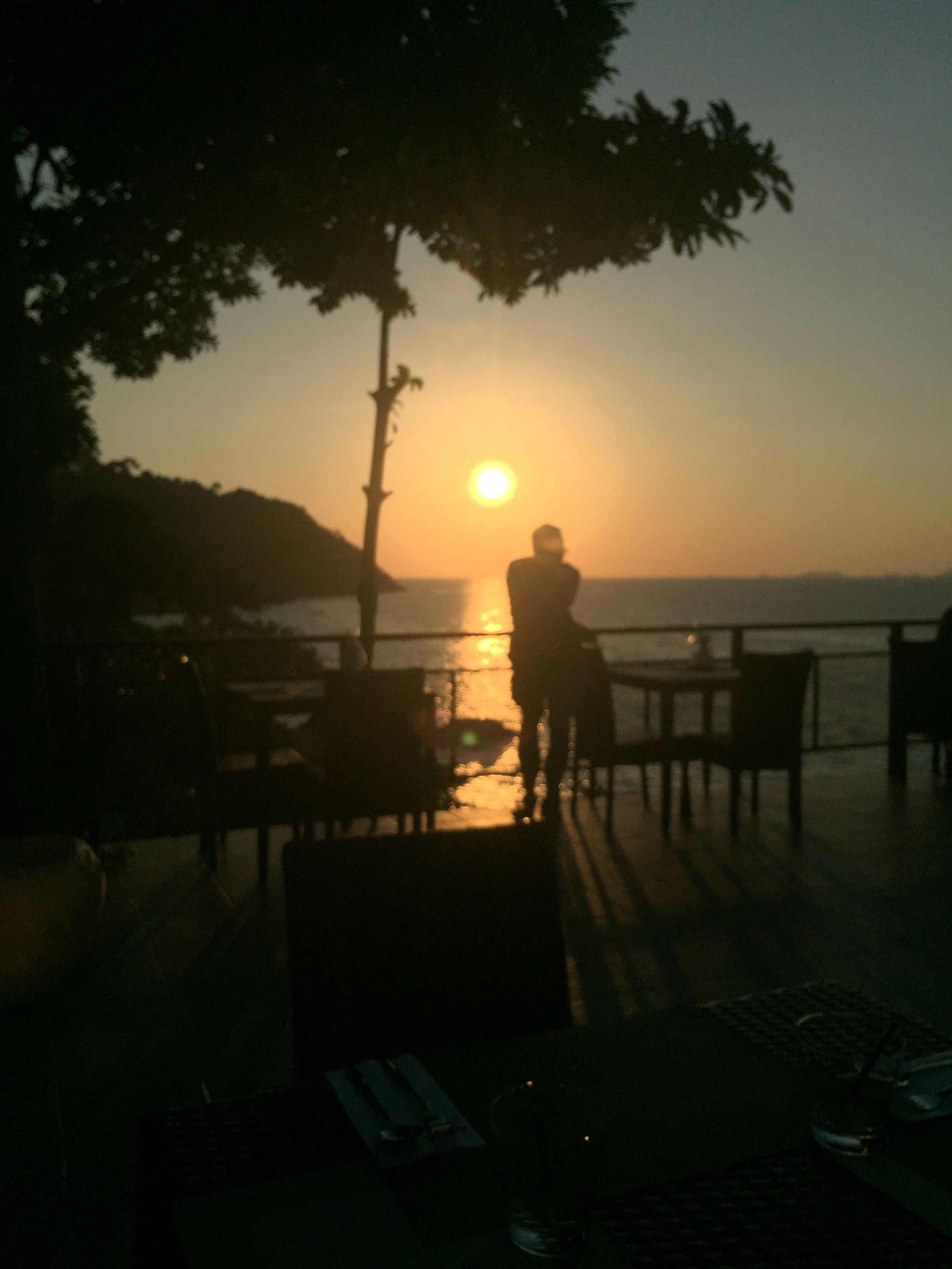 Îmi pun cerceii cei noi și o rochie pe care nu o port niciodată, în picioare șlapii mei cei portocalii, ce să faci, în sandale nu încăpea degetul, comandăm două tuk-tukuri și mergem la o terasă deasupra Sunset Beach să vedem apusul. Tuk-tukurile din Koh Lipe seamănă cu motoretele nemților din al doilea război mondial, doar că partea pasagerului e dotată cu băncuțe unde poti înghesui la nevoie patru valize și pe posesorii lor. Șoferul nostru era suspect de tânăr și vorbea mereu precipitat la mobil. La un moment dat oprește coșmelia, doi turiști din tuk-tukul din fața noastră se dau jos, tânărul nostru ne face niște semne ciudate cu mâna, mă simțeam ca într-un film cu răpiri. „Don’t worry” îmi spune turistul, „we just need to change places, it seems that our tuk-tuk wants to go on top of the island where you go”. Mă mut ca teleghidată, încă suspicioasă, când turistul îmi strigă: „you need to take care of his child also”. Urc în tuk-tuk și mă holbez la o năzbâtie de băiețel, frumos de pică, pe care noul șofer, care putea să-i fie tată, bunic sau chiar nimic, încerca să-l țină într-un loc. Ia imaginați-vă că vă urcați într-un taxi în București, iar șoferul vi-l aruncă în brațe pe fiu-său să faceți niște babysitting! Ba mai mult, totul se întâmplă într-un tuk-tuk fără nici cea mai elementară măsură de siguranță, pe niște drumuri de țară care urcă și coboară abrupt. Ăla micu o preferă pe fii-mea pe care se cațără la fiecare cinci secunde. Aia mare se uită interzisă la toată scena și îi vine să sară din tuk-tuk. Cea mică îi aduce aminte că a declarat de curând că va face bani de buzunar făcând babysitting, da, zice aia mare, dar nu cu copii de-ăștia. Încep să cânt „un elefant se legăna” și când ajung pe la elefantul cu numărul cinci, puradelul devine obsedat de degetele mele și nu își mai dorește altceva decât să le muște. Îl las inițial pentru a-i testa dantura, nu e de glumă îmi zic, are măsele bune, îmi retrag brațul, ăla mic începe să plângă, tocmai la țanc că ajunsesem. Mă dau jos năucă, trăisem o scenă suprarealistă, în spatele meu micuțul ne făcea fericit cu mâna.