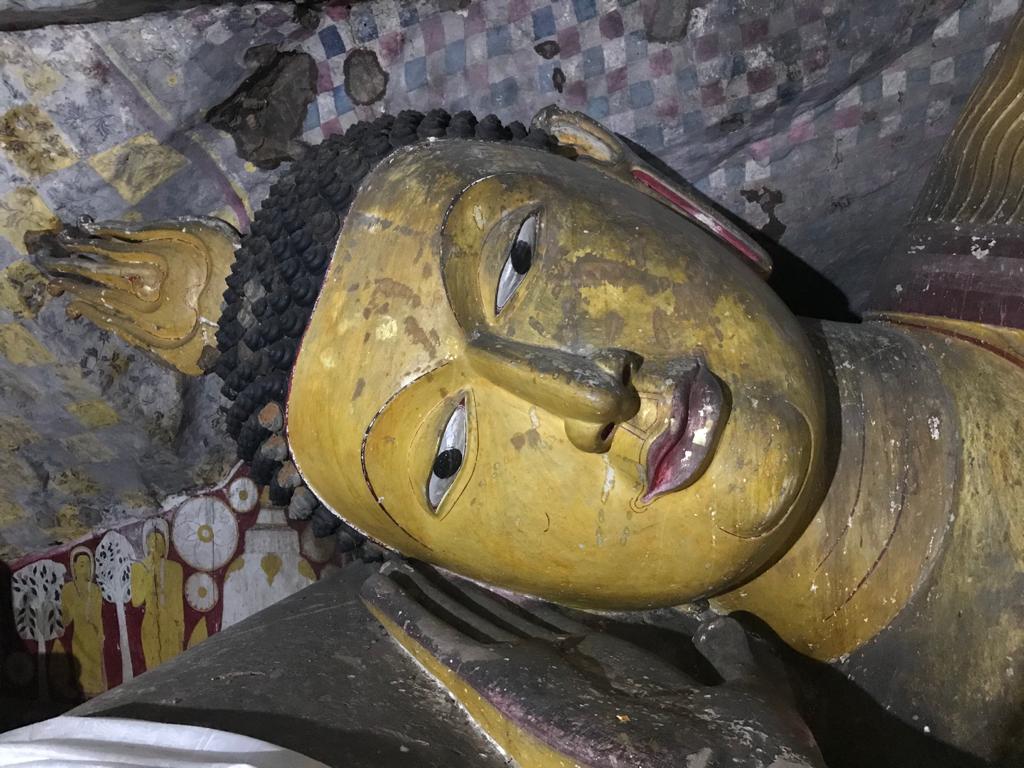 La întoarcere ne-au atașat niște fuste și iată-ne în sfârșit înăuntru. Cele cinci temple erau de fapt niște grote în muntele stâncos, pictate și transformate în locașuri religioase cu mai bine de 2000 de ani în urmă. Pe la 1800 regi din preajma locului au ridicat la intrarea în grote niște ziduri albe, frumoase. Inițial am refuzat ghidul care nu s-a lăsat respins așa ușor, începând să ne explice cele 7 diferențe dintre un Buddha culcat care doarme și unul care e mort. L-am arvunit și ne-a alergat ca la maraton printre cele 5 temple, imun la cerințele mele insistente: ”Please sir, go slowly!” Dar a meritat pentru că altfel am fi intrat boi și am fi ieșit vaci.