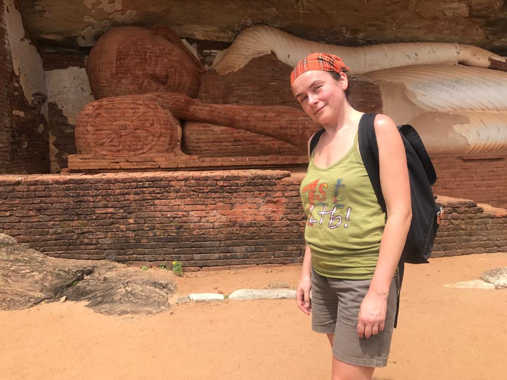 De sus, cât vedeai cu ochii în cele patru zări, un amestec splendid de pădure deasă, lacuri cu nuferi, culmi muntoase și stânca cealaltă, aia celebră, pe care urcau și coborau oameni ca la mall în București. Zic asta și din invidie, intuind că merită să le urci totuși pe amândouă. După ce eu mi-am umplut plămânii de oxigen și de frumos, iar pitica a fotografiat tot ce a putut fotografia, am pornit-o la vale. Am uitat să pomenesc de Budha cel culcat așezat într-o adâncitură a stâncii pe la jumătatea traseului, pe vremuri cel mai mare Budha din cărămidă din lume. Cu vreo 50 de ani în urmă a fost vandalizat de vânătorii de comori care i-au distrus capul și bustul.